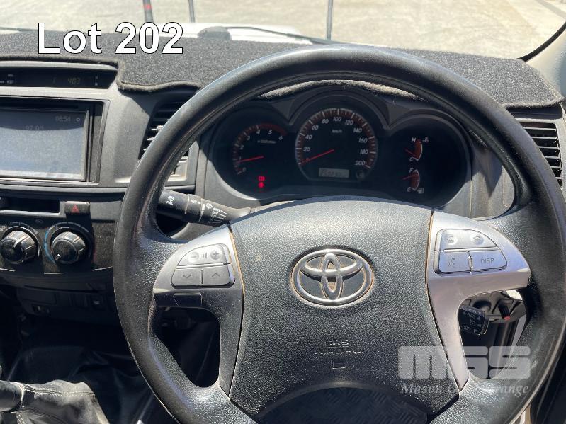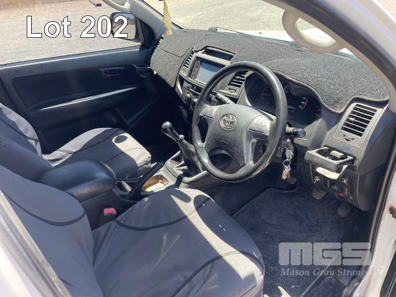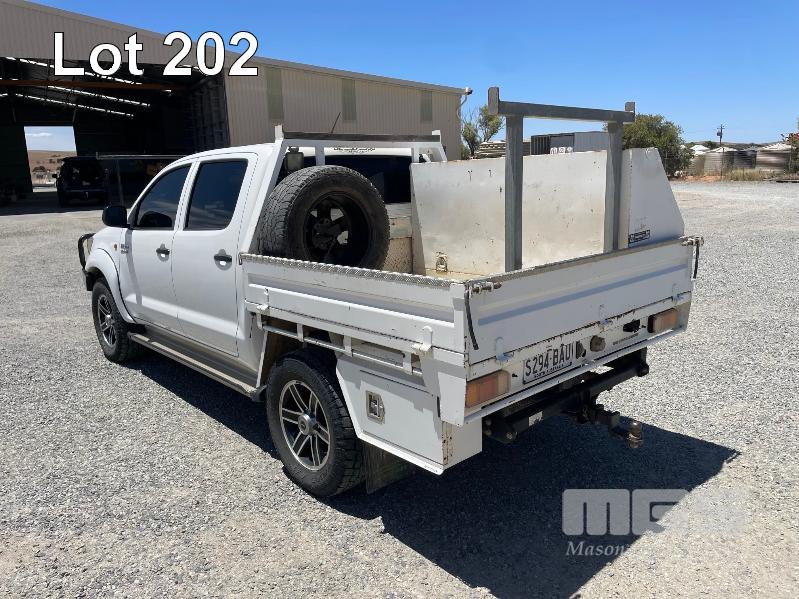 2014 TOYOTA HILUX KUN26RMY12 DUAL CAB UTE 4x4 REG: S294 BAU VIN: MR0FZ22G301083635 ODO: 250,230kms SHOWING 3.0 LITRE DTFI DT4 4 CYLINDER TURBO DIESEL, 5 SPEED MANUAL TRANSMISSION, WHITE DUCO, 4x4 AIR CON, ALLOY WHEELS, BLUETOOTH, SIDE STEP, SPOT LIGHTS, TOW BAR, DUAL BATTERIES CB RADIO STEEL DROP SIDE TRAY 2 x TOOL BOXES WATER STORAGE