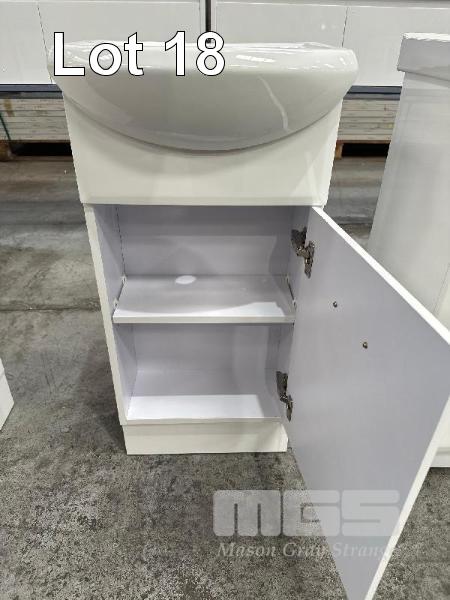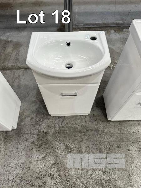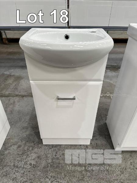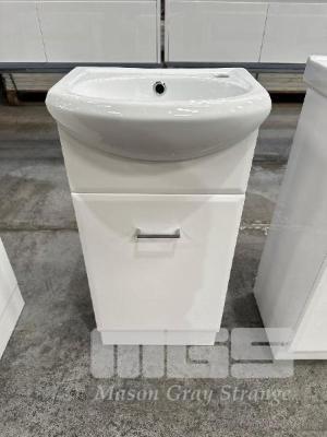 BATHROOM VANITY WITH CHINA TOP SINK, WHITE, SINGLE DOOR, CHROME HANDLE, 420 x 295 x 880mm (H) RRP $394.66, NEW IN BOX!