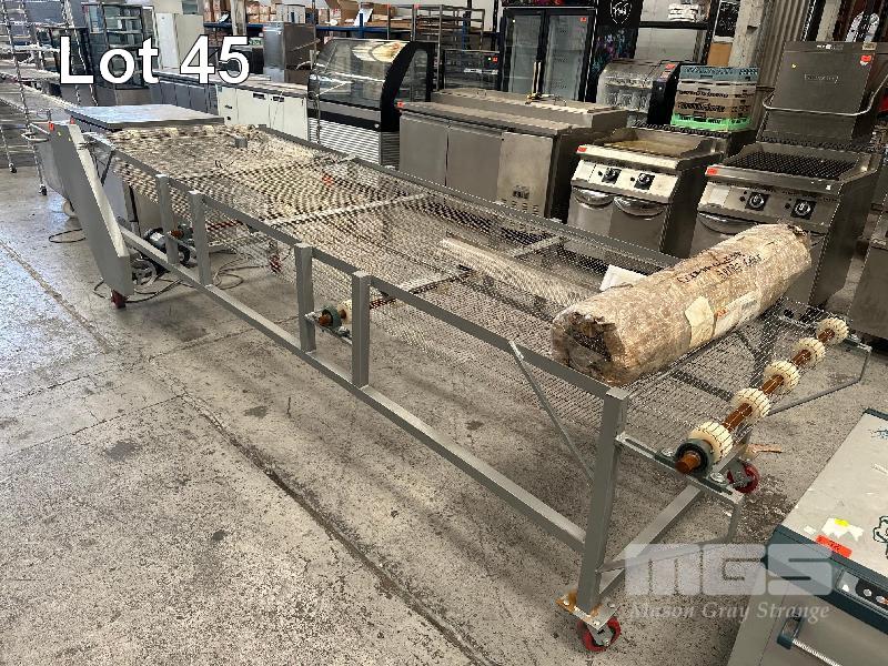 COMMERCIAL COOLING CONVEYOR, 3300 x 900mm CASTOR WHEELS, STAINLESS STEEL, MESH BELT, STEEL FRAME, WEG 3kw ELECTRIC MOTOR WITH SPARE BELT