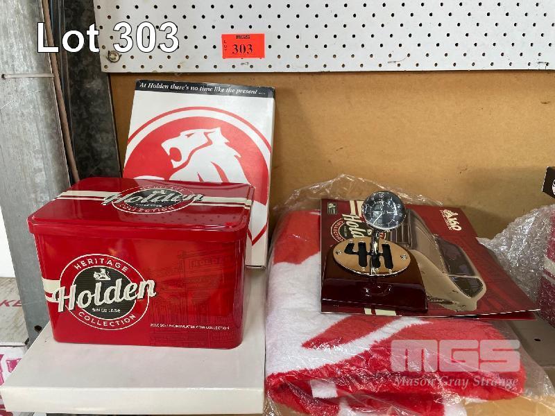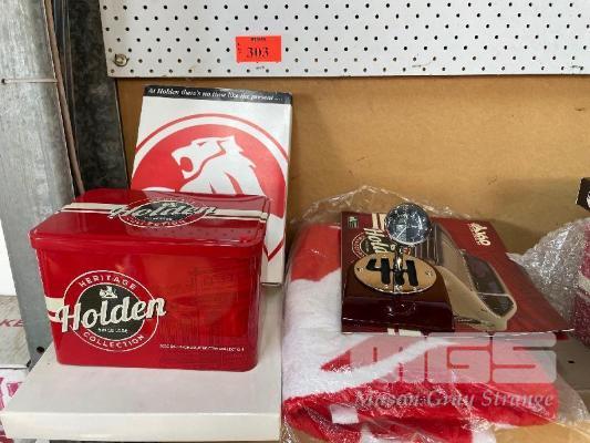 HOLDEN COLLECTABLES, 160 YEARS HOLDEN STAMP COLLECTION, TIMBER HOLDEN CLOCK, HOLDEN TOWEL, HOLDEN HERITAGE COIN COLLECTION