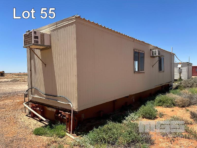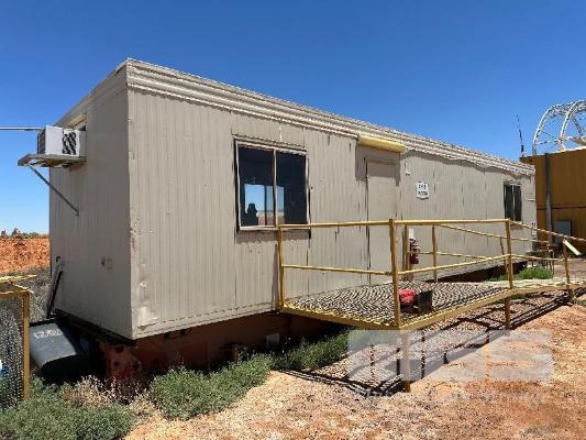 TRANSPORTABLE CRIB ROOM 12 x 3m MOUNTED ON TRANSI FLAT BASE OPEN PLAN, KITCHENETTE, TABLES, CHAIRS, PIE WARMER, 3 x WALL MOUNT A/CS, ETC