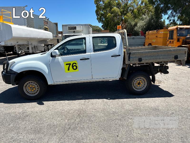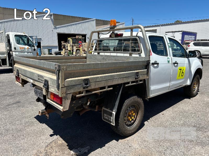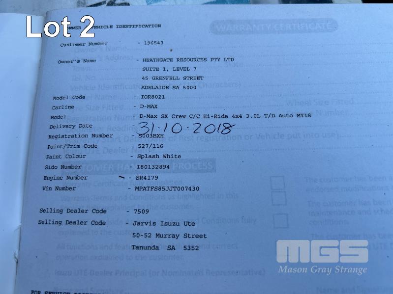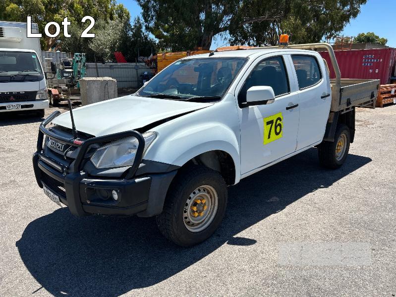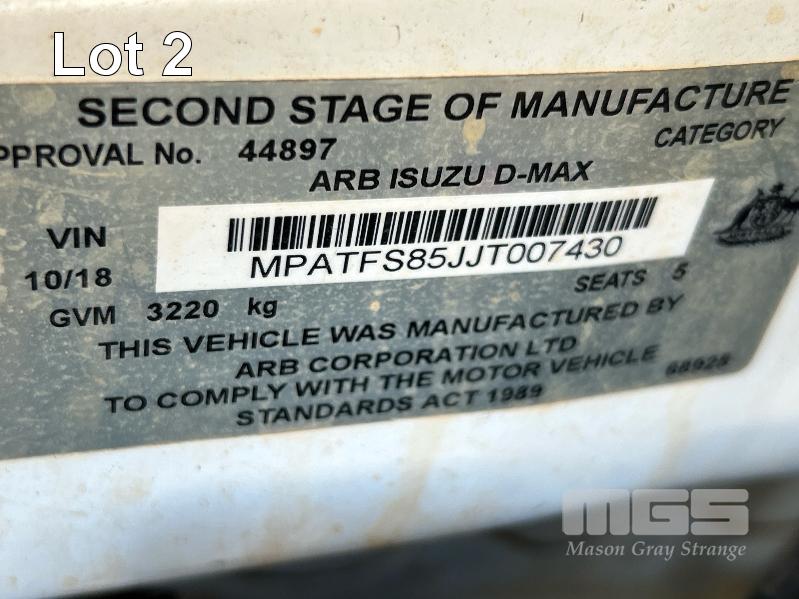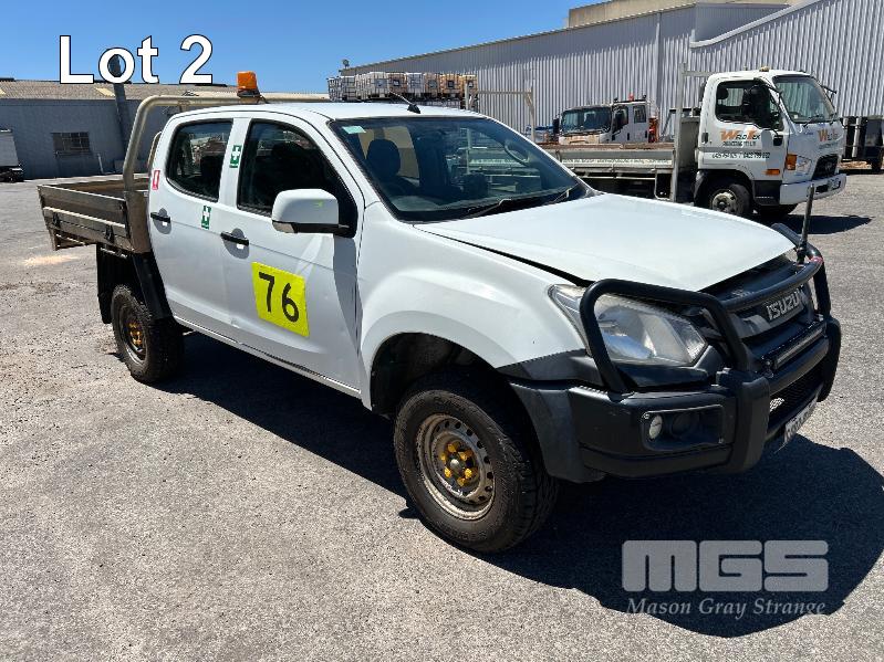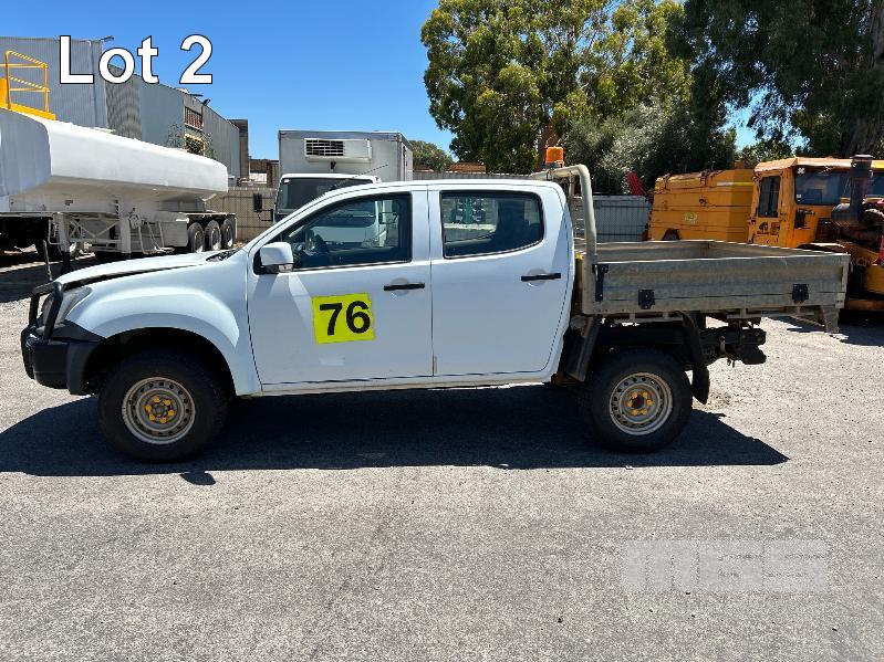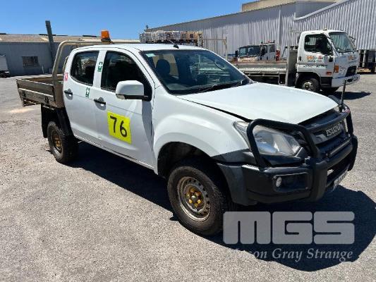 2018 ISUZU D-MAX DUAL CAB TRAY TOP UTILITY 4x4 REG: S003 BXH (SA) VIN: MPATFS85JJT007430 ENG: SR4179 ODO: 137,409kms SHOWING PLANT NO: LV76 4 CYLINDER TURBO DIESEL, AUTOMATIC TRANSMISSION, WHITE DUCO, 4 DOORS, 5 SEAT, 4x4 ABS, AIR BAG, AIR CON, BLUETOOTH, BULL BAR, CARGO BARRIER, CD PLAYER, CENTRAL LOCKING, CRUISE CONTROL, DECALS, IMMOBILISER, NUDGE BAR, POWER STEERING, POWER WINDOWS, SPARE WHEEL, SPOT LIGHTS, STEEL TRAY, WARNING LIGHTS, BATTERY ISOLATION SWITCHES KEY #53 (WITH 1 KEY/S, WITH OWNER'S MANUAL, WITH SERVICE BOOKS)