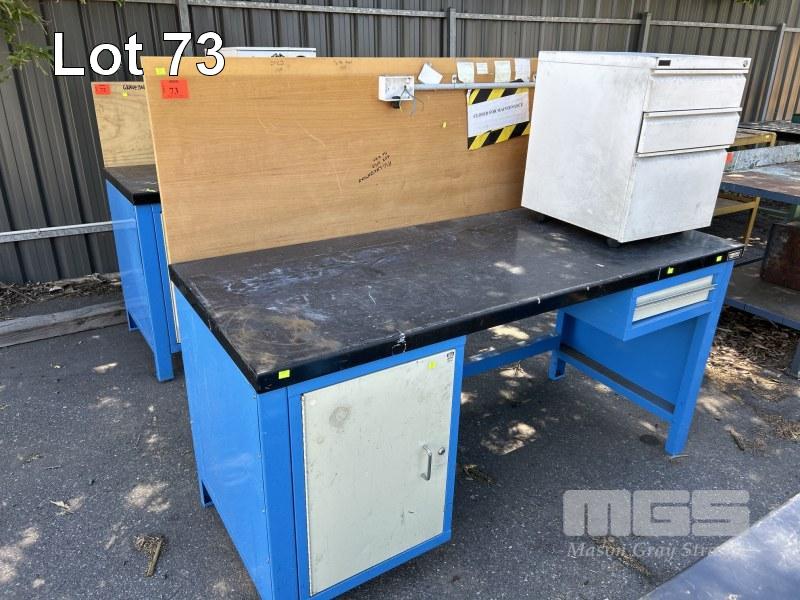 STEEL WORK BENCH, 1800 x 800 x 900mm, WITH BACKBOARD, POWER POINTS & 3 DRAWER FILING CABINET
