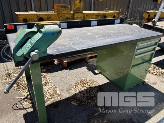 STEEL WORK BENCH, 2200 x 800 x 900mm, WITH POWER POINTS & UNDERBENCH STORAGE DRAWER & DAWN VICE, 150mm