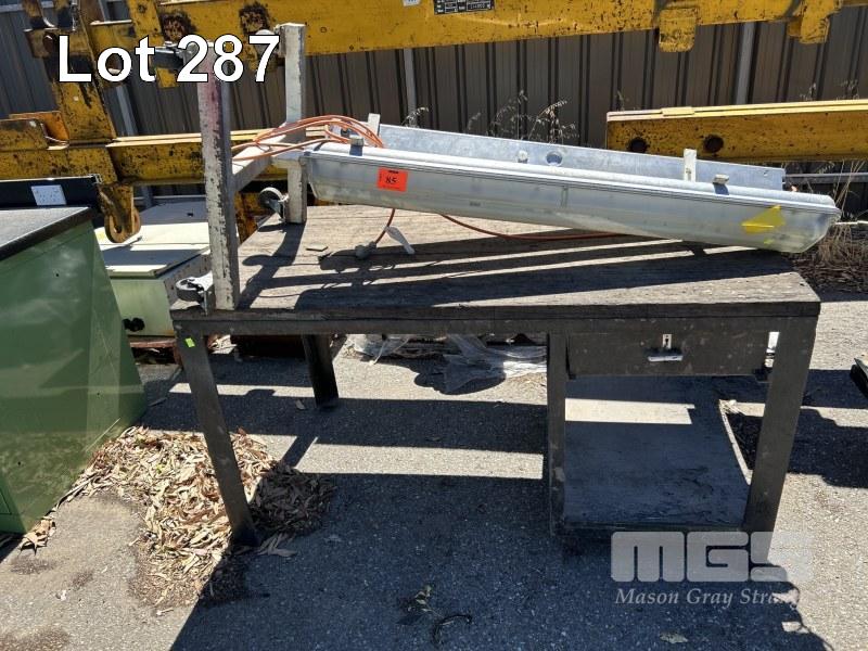 STEEL WORK BENCH, 1500 x 830 x 820mm, TIMBER TOP, 2 x WORK LIGHTS ON STEEL FRAME WITH CASTORS