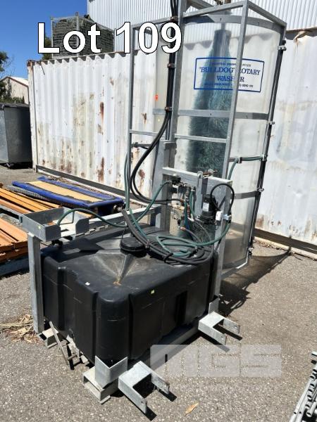 ROTARY WASHER, BULLDOG, INDUST BRUSHWARE FORK MOUNT HYDRAULICALLY DRIVEN WITH 40 LITRE POLY WATER TANK & 12V PUMP GALV STEEL FRAME & FORK POCKETS