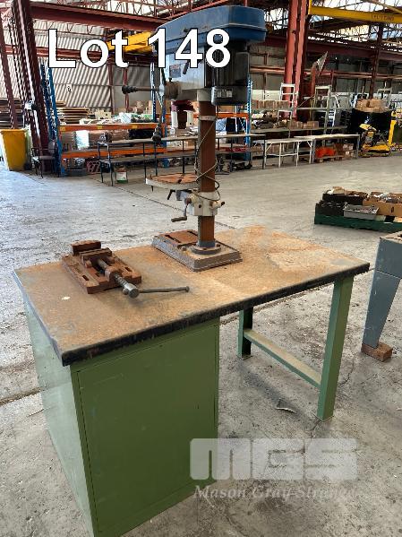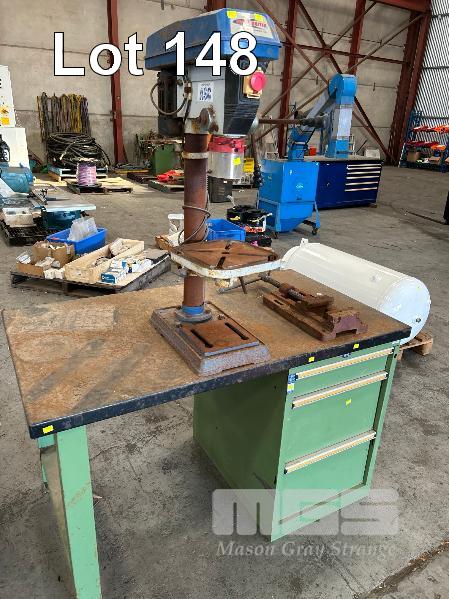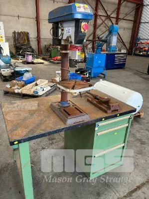 STEEL WORK BENCH, 1420 x 800 x 900mm, STEEL TOP, UNDERBENCH DRAWERS WITH DRILL PRESS, TRADE MASTER MOD: 1416 & DAWN VICE