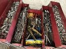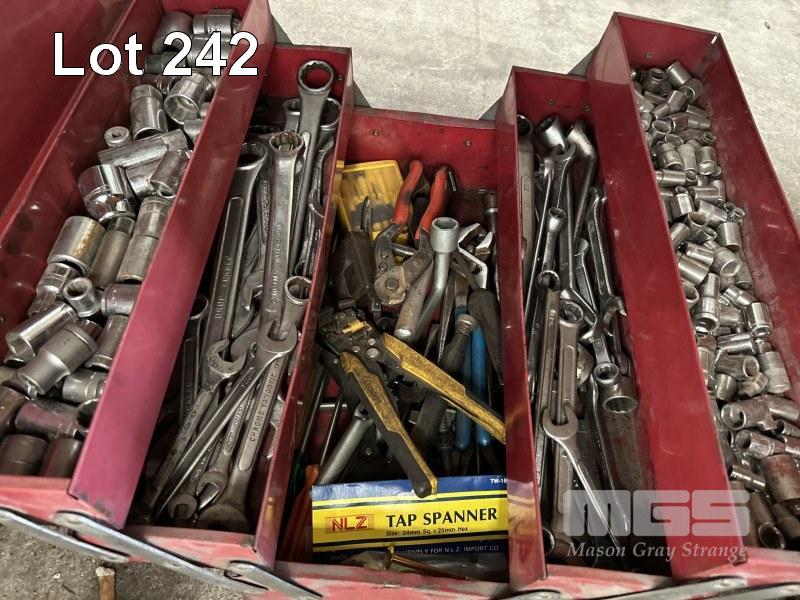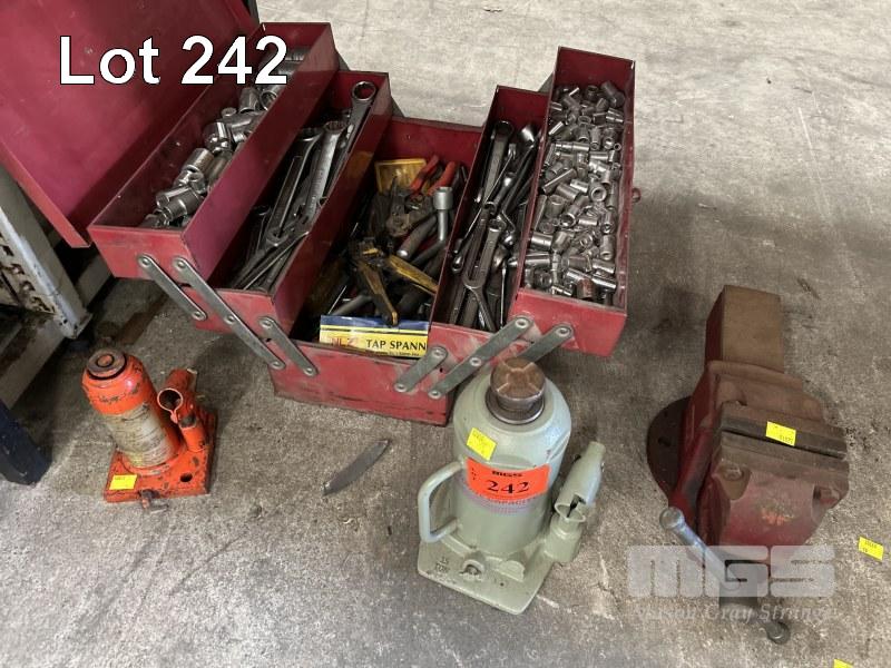 TOOL BOX & ASSORTED HAND TOOLS INCLUDING SOCKET SETS, SPANNERS, ETC, 2 x BOTTLE JACKS & WORKSHOP VICE, 100mm