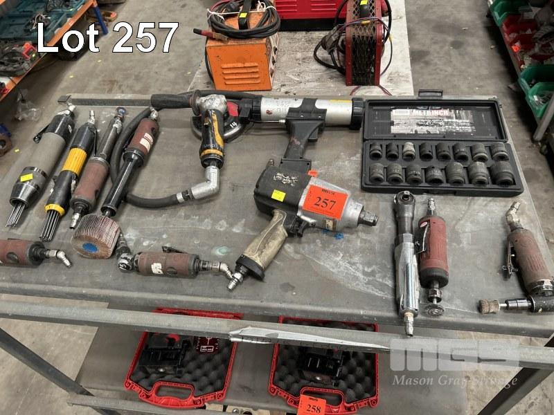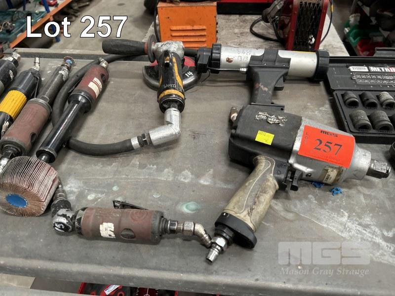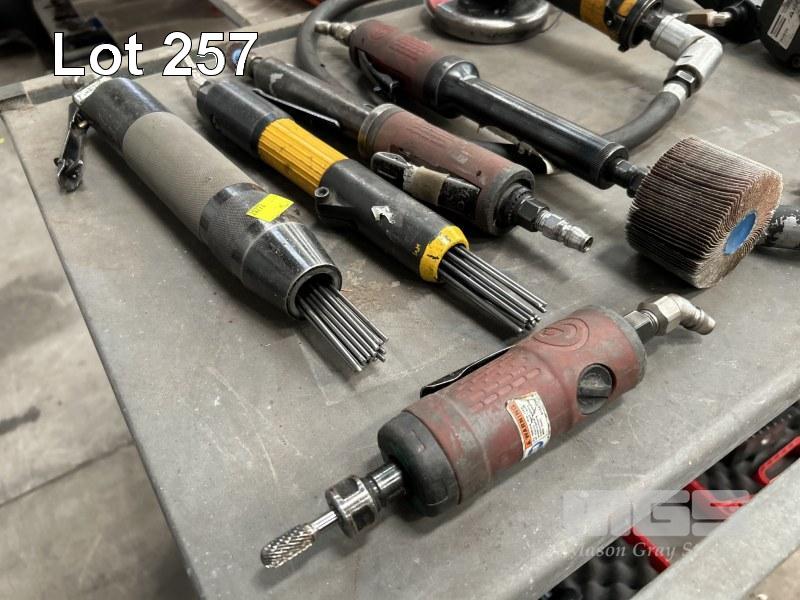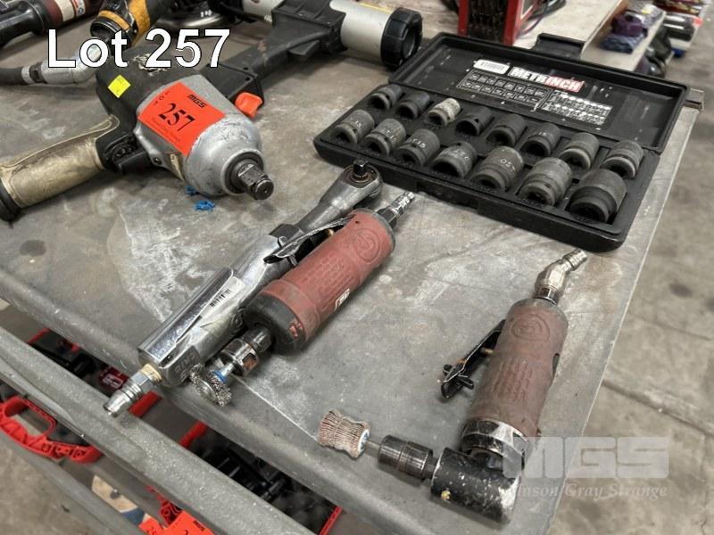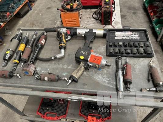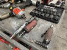 PNEUMATIC POWER TOOLS INCLUDING DIE GRINDERS, IMPACT DRIVER & SOCKET SET, RATCHET, NEEDLE DESCALING TOOLS & ANGLE GRINDER 1 x SHELF