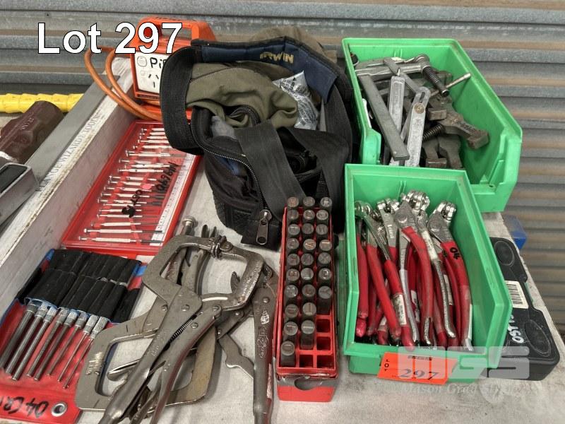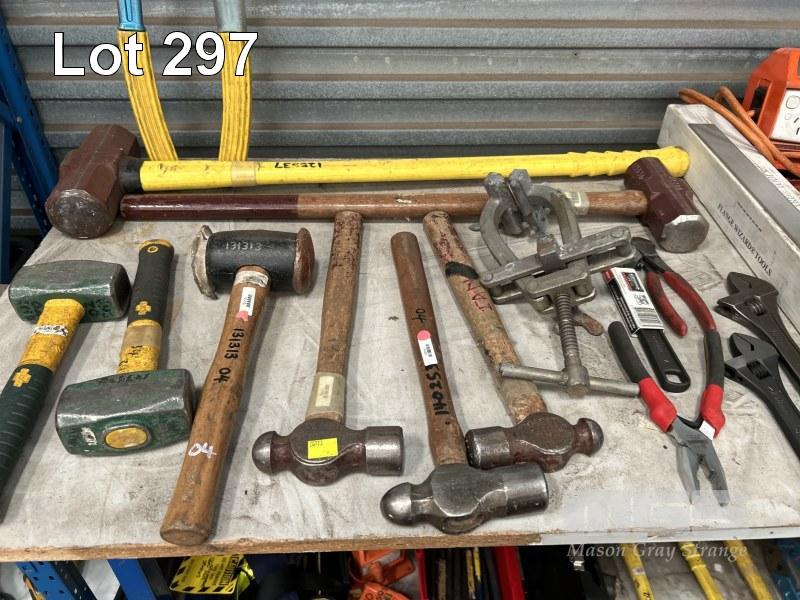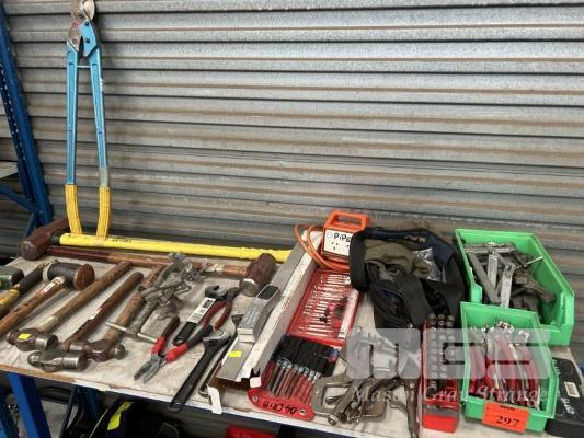HAND TOOLS INCLUDING HAMMERS, CABLE CUTTERS, SLEDGE HAMMER, PUNCHES, VICE GRIPS, ETC 1 x SHELF