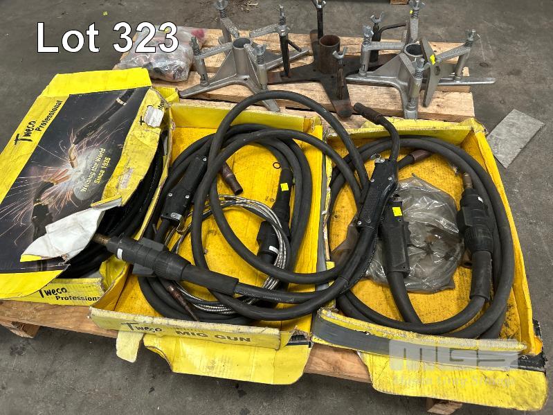 4 x MIG WELDING HAND PIECES & CABLES, TWECO PROFESSIONAL MOD: 9045-02210 TIP & SHROUD ACCESSORIES IN BAG & 3 x LARGE CABLE DRUM HOLDERS 1 x PALLET