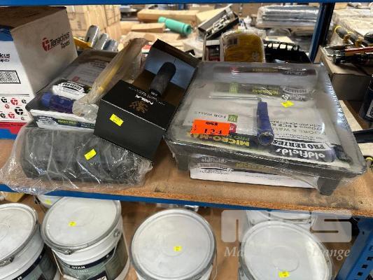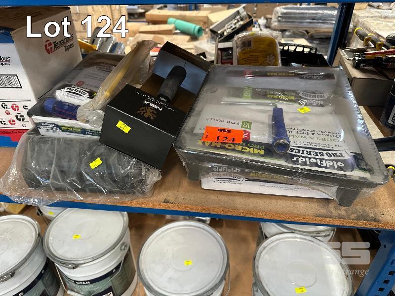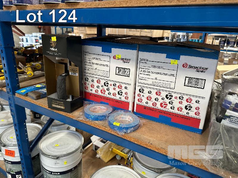 ASSORTED PAINTERS ACCESSORIES INCLUDING, 2 x CARTONS MASKING TAPE, BRUSHES, ROLLERS, ROLLER COVERS, PAINT TRAY KITS & TROWELS
