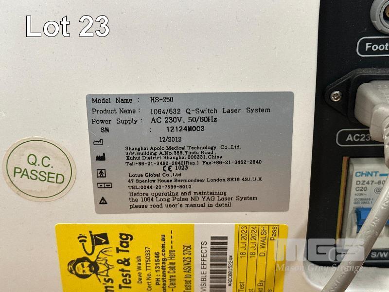 TATTOO REMOVAL MACHINE, Q SWITCH LASER SYSTEM MOD: HS-250 S/NO: 1212417003 DOM: 2012 240V WITH KEY (IN OFFICE)