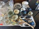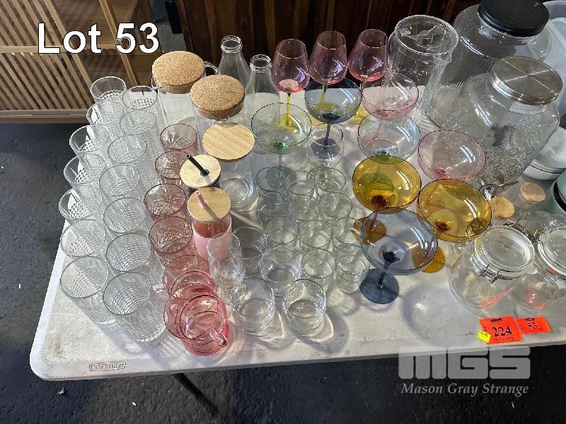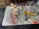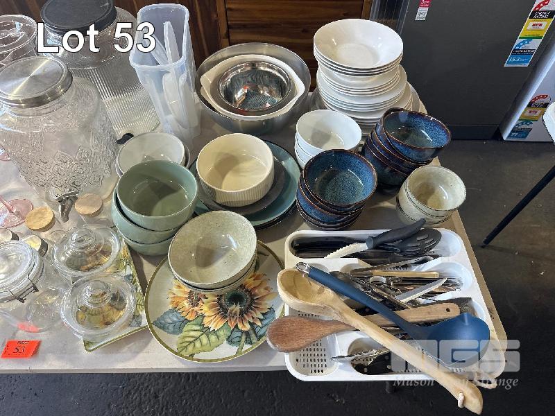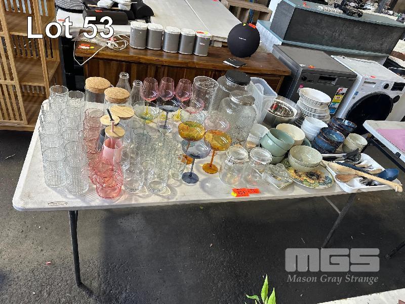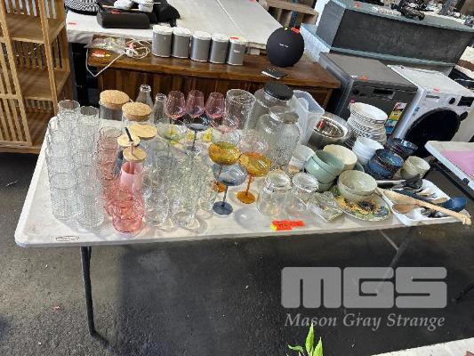 ASSORTED GLASSWARE, WATER URNS, CROCKERY, KITCHENWARE ETC CONTENTS 1 X TABLE.