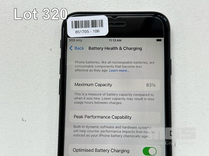 APPLE iPHONE SE, 64GB, BLACK, MODEL MX9R2X/A, BATTERY HEALTH 83% (NO CABLE, NO CHARGER) S/N:F19D9KBAPLJQ
