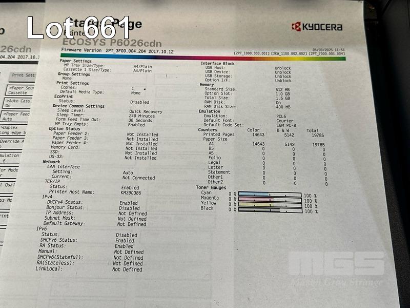 PRINTER, KYOCERA P6026cdn COLOUR LASER, USB, NETWORK, 14,643 COLOUR & 5,142 B&W PAGES (TEST PAGE ATTACHED) S/N:LW94900917