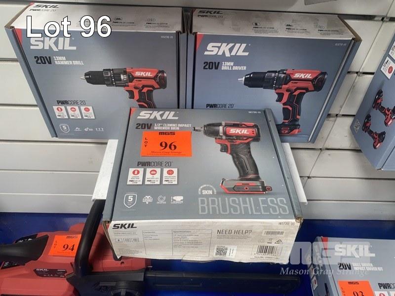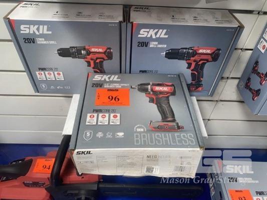 SKIL TOOLS INCLUDING, HAMMER DRILL, 20V, 13mm, MOD: HD5278E-00 DRILL DRIVER, 13mm MOD: DL5275E-00 & IMPACT WRENCH MOD: IW5739E-00 BATTERY & CHARGER NOT INCLUDED