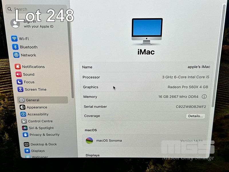 APPLE iMAC (A2116), CORE i5 8500 (8TH GEN) @ 3GHz, 16GB DDR4 RAM, 512GB SSD, BUILT-IN 21.5" RETINA DISPLAY (4096x2304), 4GB RADEON PRO 560X VIDEO, Wi-Fi, BLUETOOTH, MAC OS 14 INSTALLED, SATECHI KEYBOARD & MICROSOFT COMFORT 4500 MOUSE S/N:C02ZW0DBJWF2