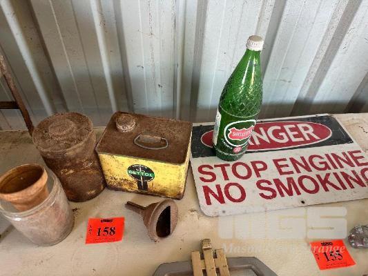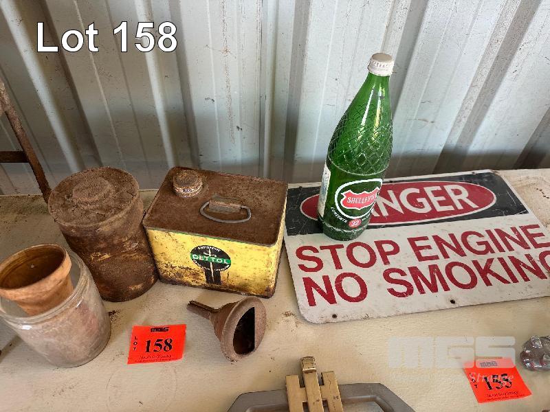 DANGER SIGN, DETTOL TIN, TIN FUNNEL LID & GLASS JAR