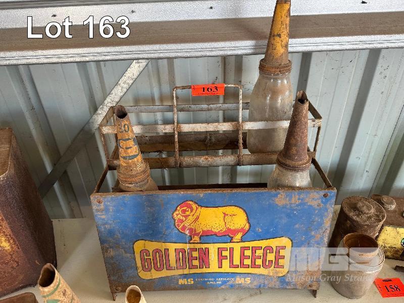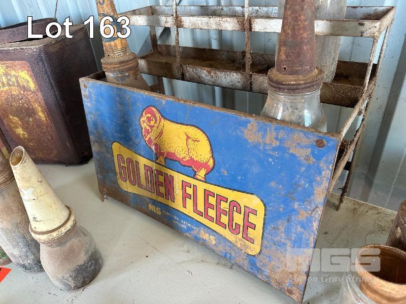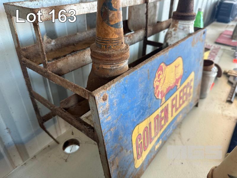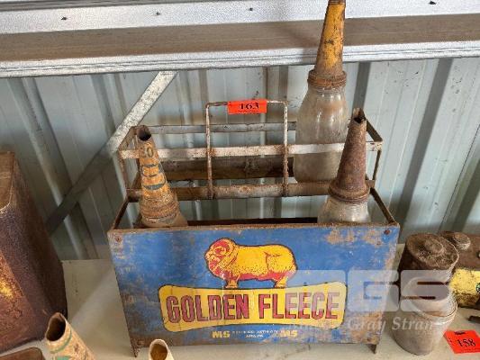 GOLDEN FLEECE OIL BOTTLE STAND, 3 x TIN POURERS & BOTTLES