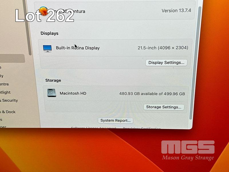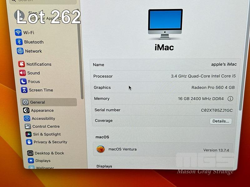 APPLE iMAC (A1418), CORE i5 7500 (7TH GEN) @ 3.4GHz, 16GB DDR4 RAM, 512GB SSD, BUILT-IN 21.5" RETINA DISPLAY (4096x2304), 4GB RADEON PRO 560 VIDEO, Wi-Fi, BLUETOOTH, MAC OS 13 INSTALLED (NO KEYBOARD, NO MOUSE) S/N:C02XT05ZJ1GC