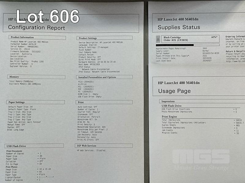 PRINTER, HP LASERJET PRO 400 M401dn, USB, NETWORK, 58,033 PAGES (TEST PAGE ATTACHED S/N:VNH6803901