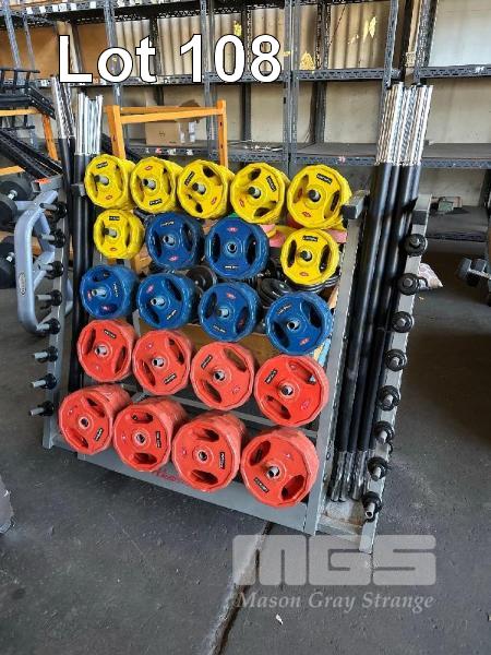 BARBELL & PLATE RACK, HEALTHSTREAM WITH 14 x BARBELLS, 1.25, 2.5 & 5kg PLATES