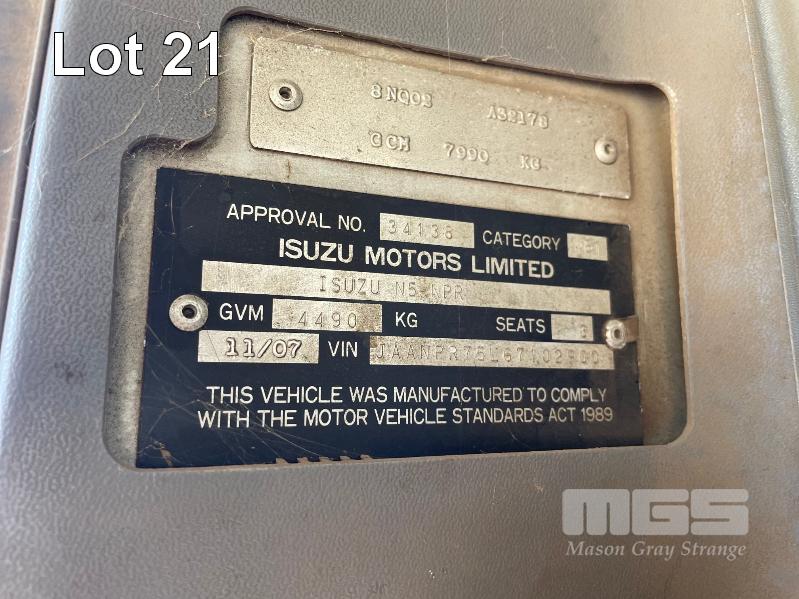 2007 ISUZU NPR 4X2 FLAT BED TRUCK REG: XSP251 (SA) (EXPIRED) VIN: JAANPR75L6710290C ODO: 275021 SITEC 150, 5 SPEED MANUAL, DIESEL, 2 DOORS, 3 SEAT, AIR CON, BULL BAR, STEEL TRAY, TRAY: 4525 x 2450mm (WITH 1 KEY/S, NO OWNER'S MANUAL, NO SERVICE BOOKS)