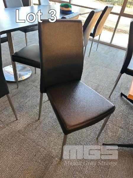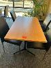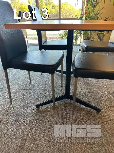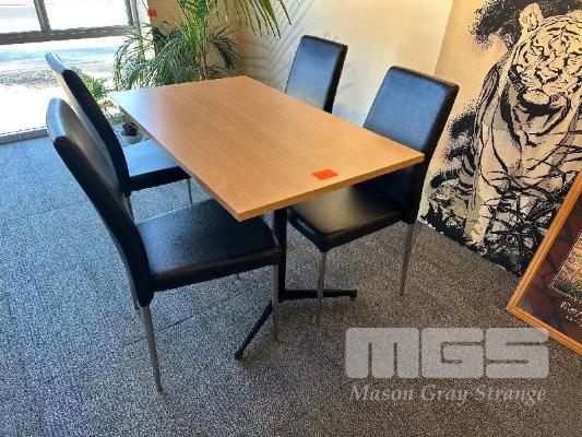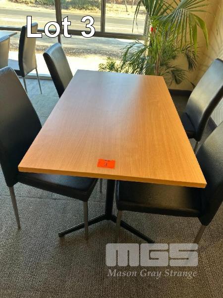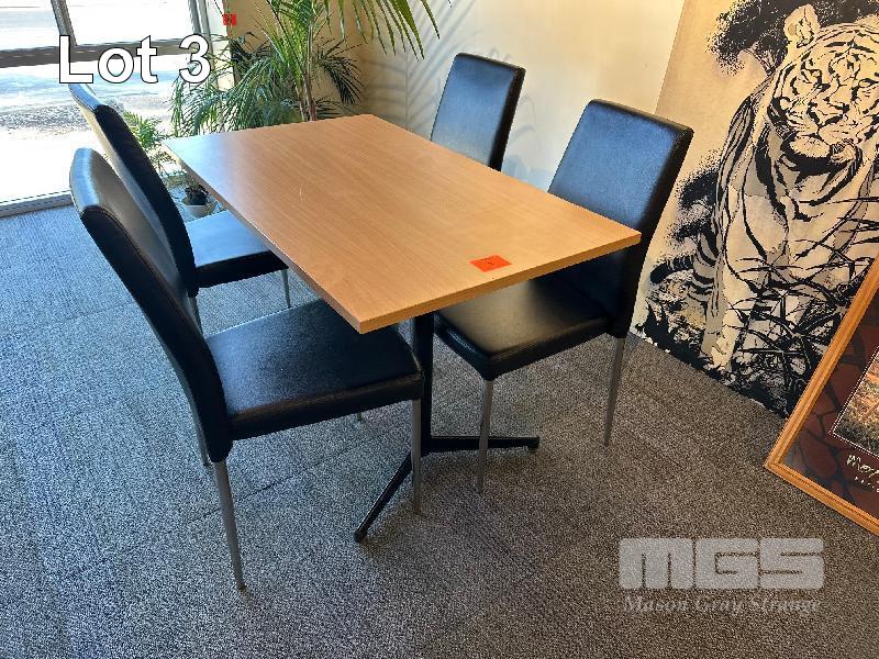 1 x TABLE, BEECH TIMBER LAMINATE TOP, 1200 x 700mm 4 x HIGH BACK DINING CHAIRS, BLACK VINYL, CHROME LEGS