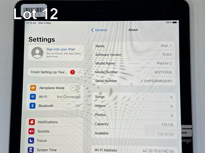 APPLE iPAD AIR 2, 128GB, Wi-Fi, SPACE GREY, MODEL MGTX2X/A, A1566 (NO CABLE, NO CHARGER) S/N:DMPSJRNRG5W1