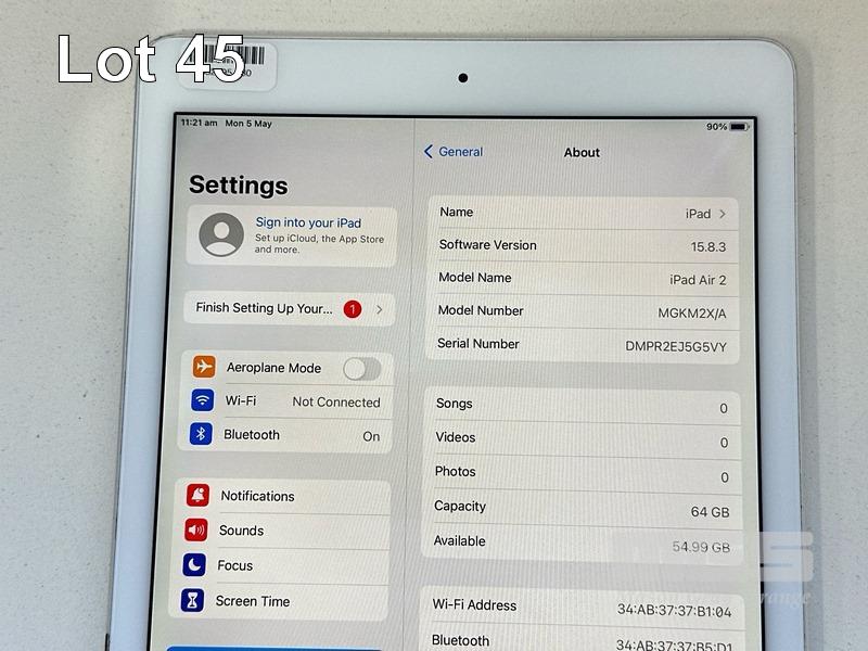 APPLE iPAD AIR 2, 64GB, Wi-Fi, SILVER, MODEL MGKM2X/A, A1566 (NO CABLE, NO CHARGER) (NOTE: CRACKED BOTTOM RIGHT OF SCREEN) S/N:DMPR2EJ5G5VY