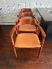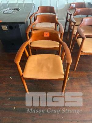 6 x SOLID TIMBER DINING CHAIRS, CURVED TIMBER, TERRACOTTA VINYL SEATS