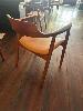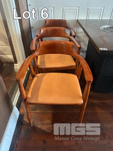 6 x SOLID TIMBER DINING CHAIRS, CURVED TIMBER, TERRACOTTA VINYL SEATS