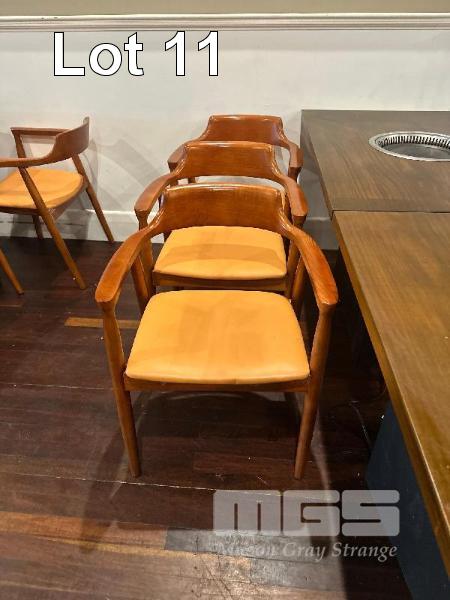 6 x SOLID TIMBER DINING CHAIRS, CURVED TIMBER, TERRACOTTA VINYL SEATS