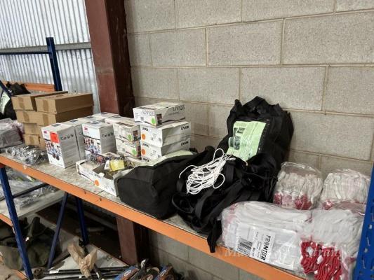 PERSONNEL SAFETY EQUIPMENT INCLUDING SAFETY GLASSES, UVEX, PHEOS, 9 x BOXES, 5/BOX, 48 x FRONTIER SWAGGY LEATHER GLOVES, SMALL, 150 x MILLERS HAND TOOL SLINGS & STRAPS, 6 x EAR MUFFS, 3M SUIT HARD HATS & 8 x BOXES GLOVE BELT CLIPS AS NEW 1 x SHELF