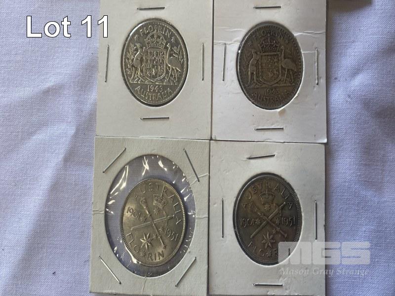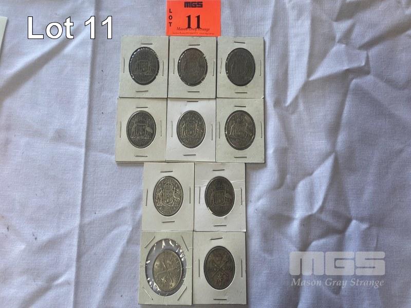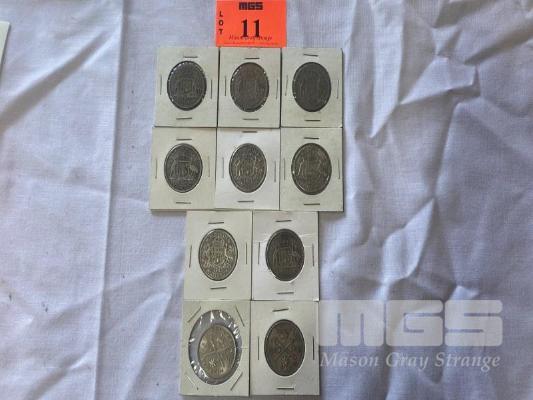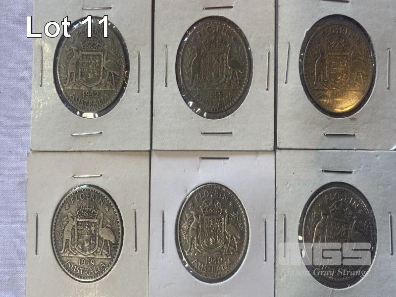 10 X ASSORTED AUSTRALIAN FLORINS INC 1939, 2 X 1940, 2 X 1943, 3 X 1952 & 2 X 1951 COMMEMORATIVE