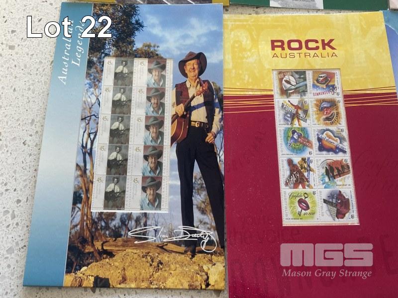6 X COMMEMORATIVE STAMP SETS INC QUEEN ELIZABETH 75TH BIRTHDAY, AUSTRALIAN OLYMPIC LEGENDS, THE DON, SLIM DUSTY, AUSTRALIANS IN ANTARTIC, ROCK AUSTRALIA