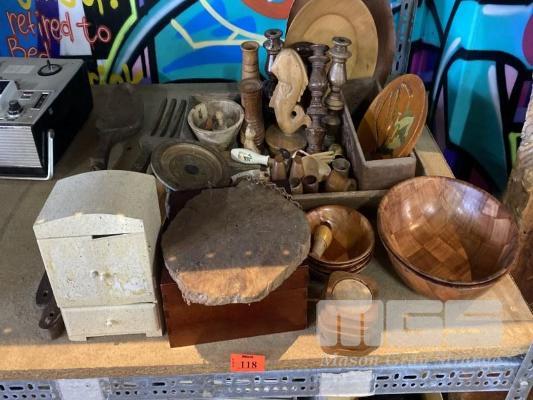 ASSORTED WOODWARE, CARVINGS, BOWLS, ETC