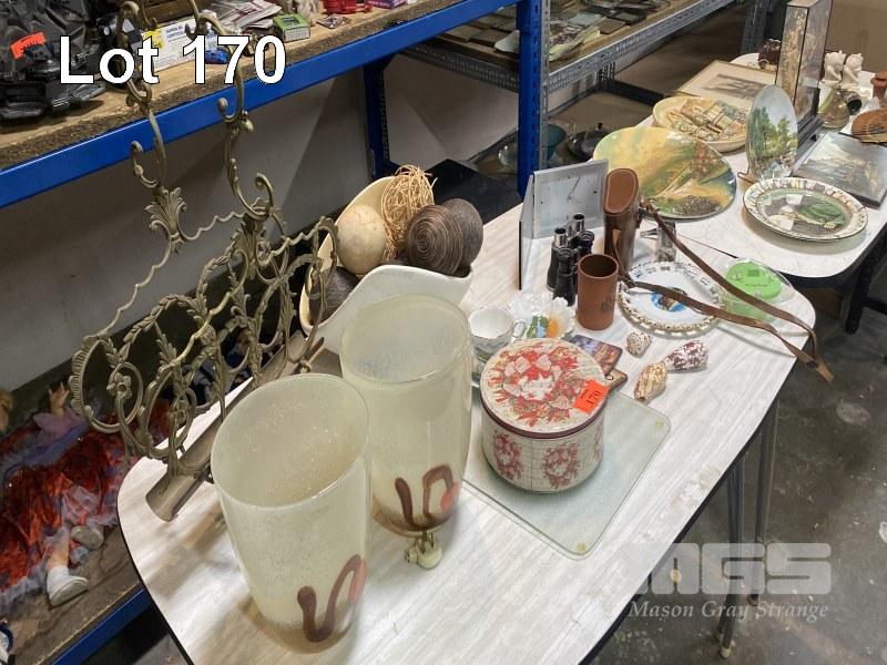 HOMEWARES, 2 x SETS BINOCULARS, SEA SHELLS, PAIR ART GLASS VASES & BRASS MAGAZINE HOLDER