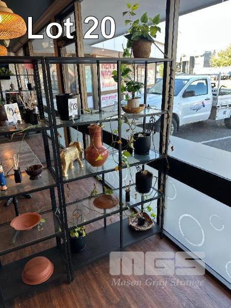 2 x 5 TIER SHELF UNITS, BLACK STEEL FRAME, GLASS SHELVES