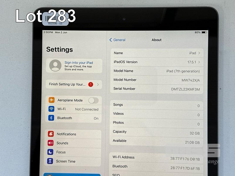 APPLE iPAD 7TH GEN, 32GB, Wi-Fi, SPACE GREY, MODEL MW742X/A, A2197 WITH CABLE & CHARGER (NOTE: MINOR SCRATCHES ON SCREEN) S/N:DMTZL22KMF3M