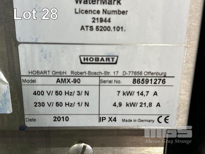 COMMERCIAL DISHWASHER, HOBART MOD: AMX-90 DOM: 2010 415V, HARDWIRED WITH 13 x DISH RACKS