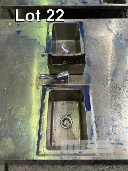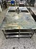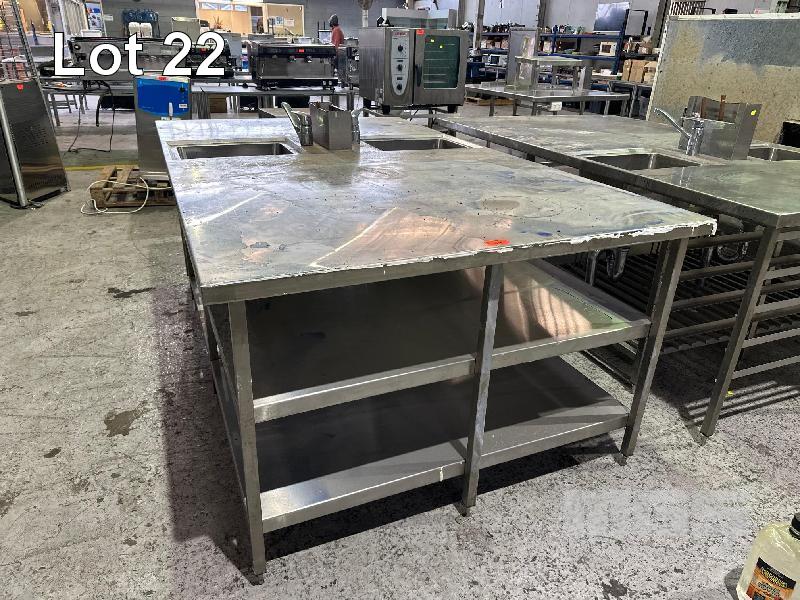 LARGE STAINLESS STEEL CENTRE ISLAND BENCH WITH 2 x DEEP BOWL SINKS, UNDER BENCH STORAGE 2300 x 1400 x 910mm (H)