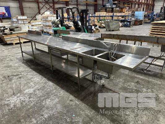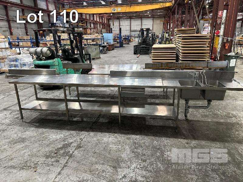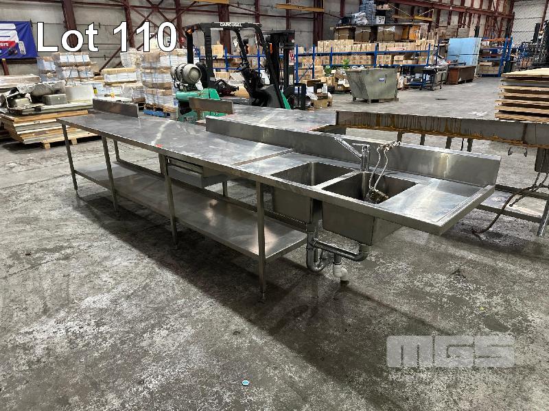 STAINLESS STEEL BENCH, 5100 x 700 x 910mm (H), 2 TIER, TWIN BOWL, DRAWER & SPLASHBACK