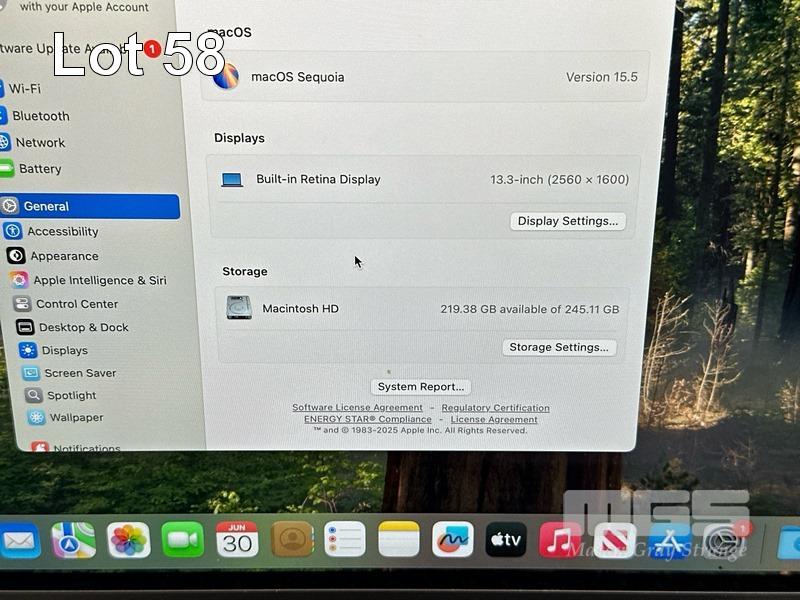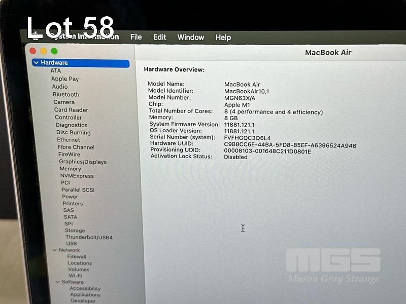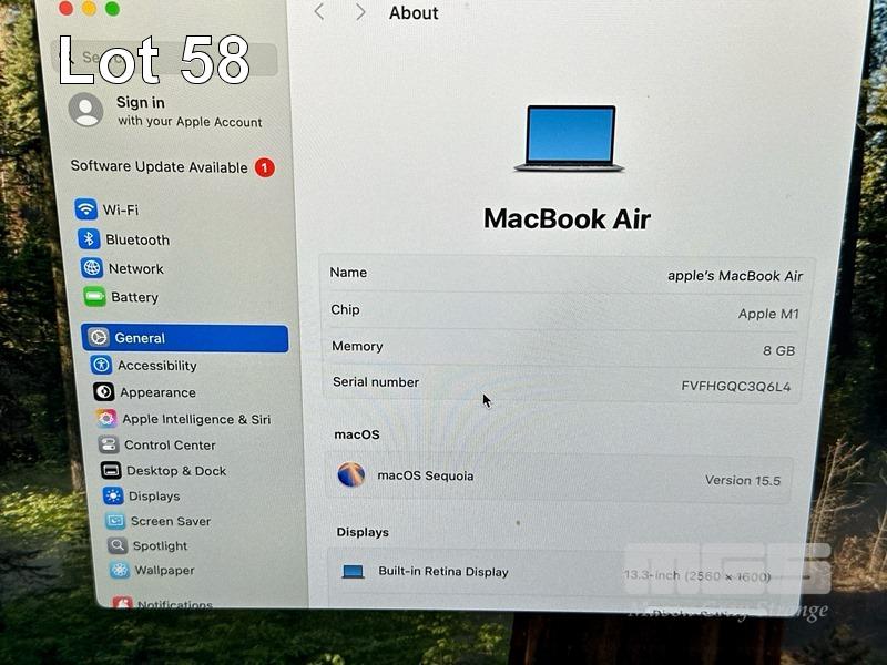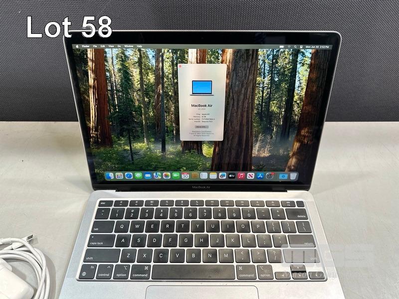 LAPTOP, APPLE MACBOOK AIR (A2337), MGN93X/A, APPLE M1 8 CPU, 7 GPU, 8GB RAM, 256GB SSD, 13.3" RETINA DISPLAY (2560x1600), Wi-Fi, BLUETOOTH, MAC OS 15 INSTALLED & USB-C POWER SUPPLY (30W) (NOTE: MINOR MARKS ON SCREEN) S/N:FVFHGQC3Q6L4