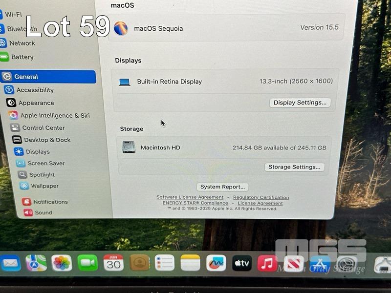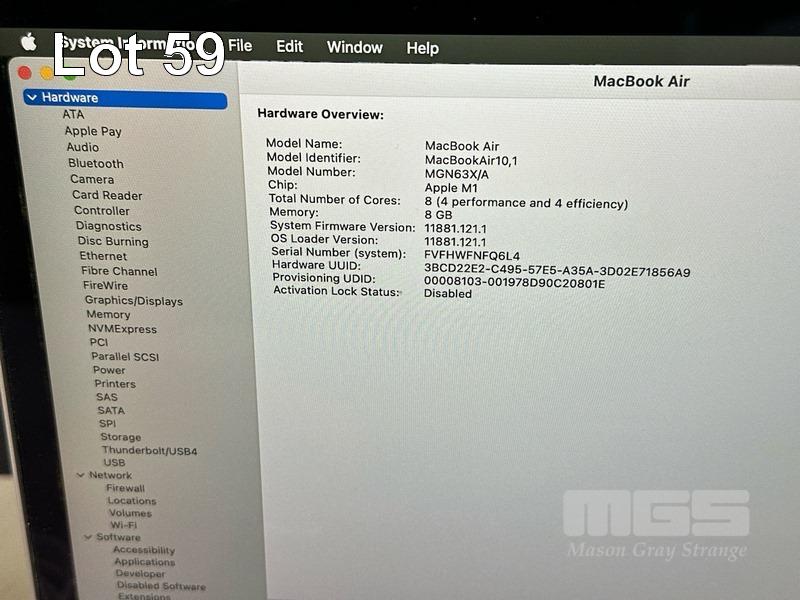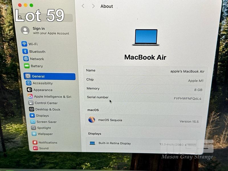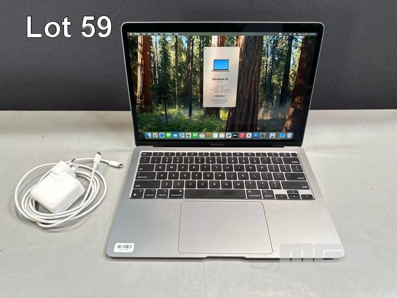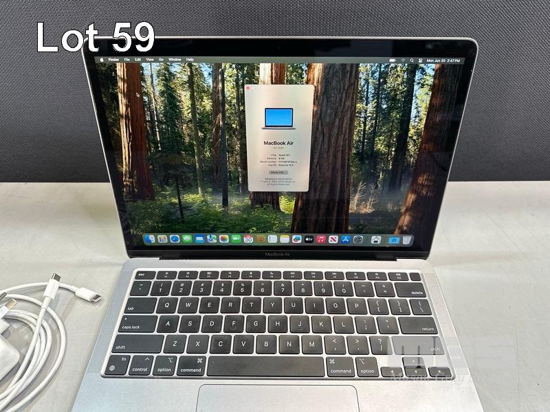 LAPTOP, APPLE MACBOOK AIR (A2337), MGN93X/A, APPLE M1 8 CPU, 7 GPU, 8GB RAM, 256GB SSD, 13.3" RETINA DISPLAY (2560x1600), Wi-Fi, BLUETOOTH, MAC OS 15 INSTALLED & USB-C POWER SUPPLY (30W) (NOTE: MINOR MARKS ON SCREEN) S/N:FVFHWFNFQ6L4