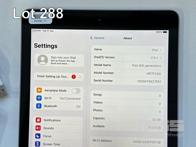 APPLE iPAD 6TH GEN, 32GB, Wi-Fi, SPACE GREY, MODEL MR7F2X/A, A1893 WITH CABLE & CHARGER (NOTE: MINOR SCRATCHES ON SCREEN) S/N:DMQX93KZJF8J