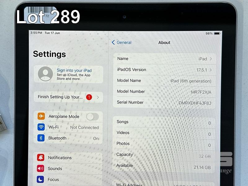 APPLE iPAD 6TH GEN, 32GB, Wi-Fi, SPACE GREY, MODEL MR7F2X/A, A1893 WITH CABLE & CHARGER (NOTE: MINOR SCRATCHES ON SCREEN) S/N:DMPXDHF4JF8J