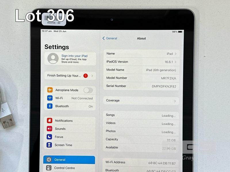 APPLE iPAD 6TH GEN, 32GB, Wi-Fi, SPACE GREY, MODEL MR7F2X/A, A1893 WITH CABLE & CHARGER (NOTE: MINOR SCRATCHES ON SCREEN) S/N:DMPXDFKNJF8J