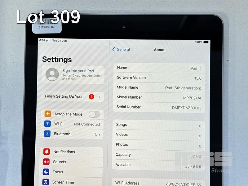 APPLE iPAD 6TH GEN, 32GB, Wi-Fi, SPACE GREY, MODEL MR7F2X/A, A1893 WITH CABLE & CHARGER (NOTE: MINOR SCRATCHES ON SCREEN) S/N:DMPXD6Z8JF8J